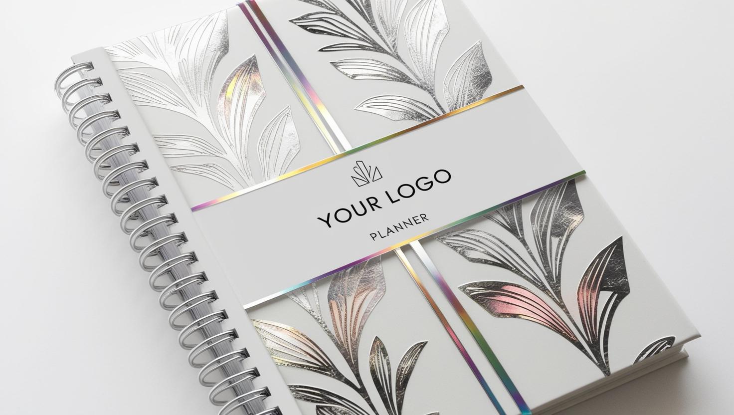 Planner w oprawie spiralnej z personalizowaną okładką, idealny do codziennego planowania. Miękka, ale wzmocniona okładka zdobiona jest holograficzną folią w stylu art deco. Twoje logo uszlachetniamy lakierem 3D, nadając mu wyrazistą formę i prestiżowy charakter.